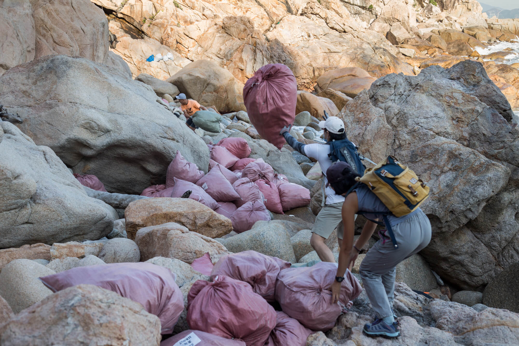 因為船隻難以靠近岩石嶙峋的石灘,我們擬將全部垃圾沿來路搬回近市中心的垃圾收集站。才開始動手搬,啊,糟了—— 68袋,還要逐一搬上山。但,這又怨得誰呢?我們用拋的、用揹的、用抓的,沿著逐漸潮漲的岩岸、攀越一個大斜坡、爬過又窄又滑的小徑,再走一段小路,彼此互換位置,如螞蟻般把一袋袋垃圾接過來,又一袋袋的送上去。來來回回,沒完沒了。直至日落西山,宣告下午茶泡湯,心中暗暗不忿:「我要退隊,我要出院! 我要退隊,我要出院!」