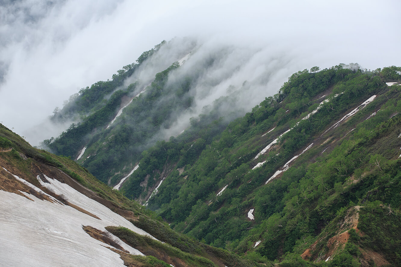 山脊雖是下引,但當中卻又有好些升降路段。途中經過的西遠見山和大遠見山的展望原亦不錯,可惜雲霧茫茫,緣慳一面。唯獨在小遠見山,才能一窺唐松岳和爺ヶ岳之巔。要是天色明朗,視野肯定極佳!