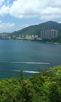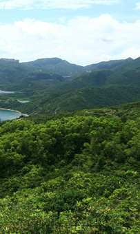 及後縱走龍脊線上,偶爾輕升微降。先後賞白筆山和大浪灣景致。隨後輕降山徑至分岔路,右踏(左可往龍脊的初段)平緩的林蔭山徑,再右接水泥路(左可走至石澳道),此段途中遠望柴灣市區。最後接上泥徑,下降至屋村,再往大浪灣完成整段港島徑行程。