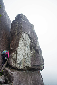 這日天氣涼快,自覺體力仍可應付,便隨隊續走行程的第二段。我們在哨牙石側極為陡直的缺口小心攀爬而下(也可從哨牙石後方的小徑繞行而過),進入鳳冠南巖。此後的鳳啄台、刀片石、破邊石等各有特色,可惜雲霧漸濃,也要趕路,未能一一細賞。走這路段的山友不少,期間道上的一位大叔忽地大呼,未幾遠處傳來應和之聲,似乎是互通所在位置的訊息。如此再三呼應往來,初聽耳目一新,二聽耳朵難堪,三聽拔腿欲奔。