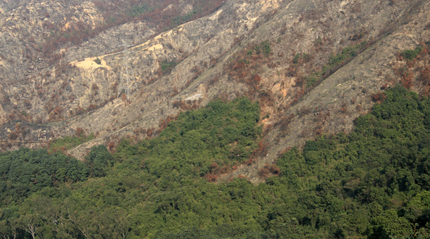 隨後沿著西北方的水泥梯級下降至木製涼亭。此處大致分左、中、右三道路線:左路為屯門徑第2段接麥理浩徑;中路亦為屯門徑第2段接富地路;而右方一路則可下走虎峽谷徑往藍地水塘。選取左路行走,及後接上鋪設完好的石級下降至由晨運人士搭建的若夢園,再左走接上麥理浩徑第10段後,最後沿徑右轉下降至何福堂書院。