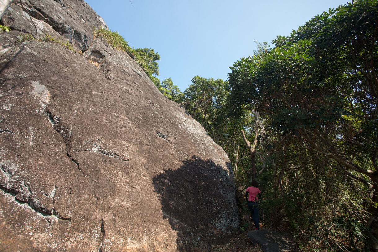 往後的路段,又再茂密起來。半身陷入灌叢之中,芒萁不斷往身上揉拂,被逼來個孢子浴。終於,登上了牛耳石山。峰頂其實離麥理浩徑不過數步之遙,但相比由主徑輕鬆登遊,從隱徑緩步上攀所領受的是天壤之別。