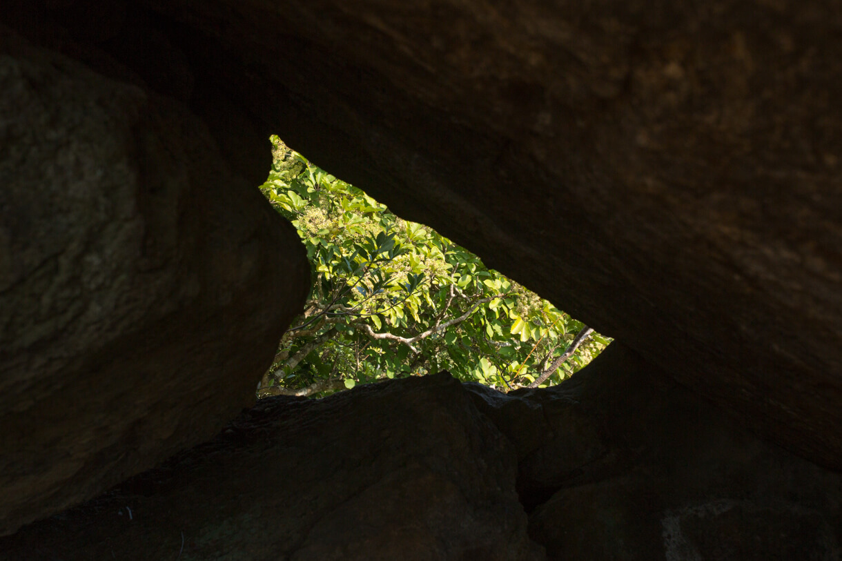 離澗後,隨即鑽進牛耳石山西南面的山徑。此間人跡杳然,卻別有天地。半山之上,竟有一偌大的天然石台,背負著一幅巨巖。曲膝坐下,吸一口氣,凝聽鳥鳴。微風涼而不寒,陽光和而不烈。樹影下苔蘚昏黃,枝椏間山巒朦朧。景致雖然清淡,內心的舒泰卻無以名之。幽邃的氛圍,令我對牛耳石山有一種特別的偏愛。