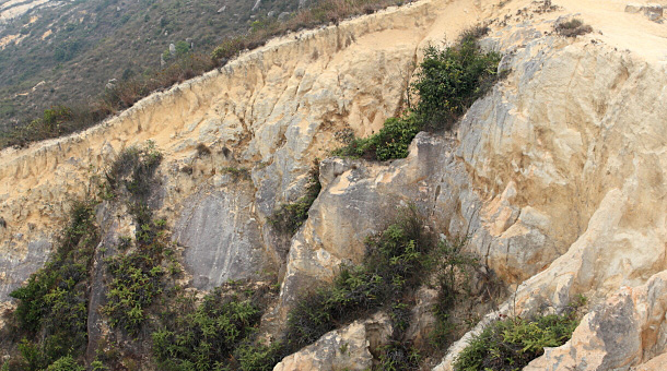 圓頭山的路線以浮沙碎石路段為主。途中可遠眺青山腹地,處處黃沙碎石,草木稀疏,甚感蒼涼。